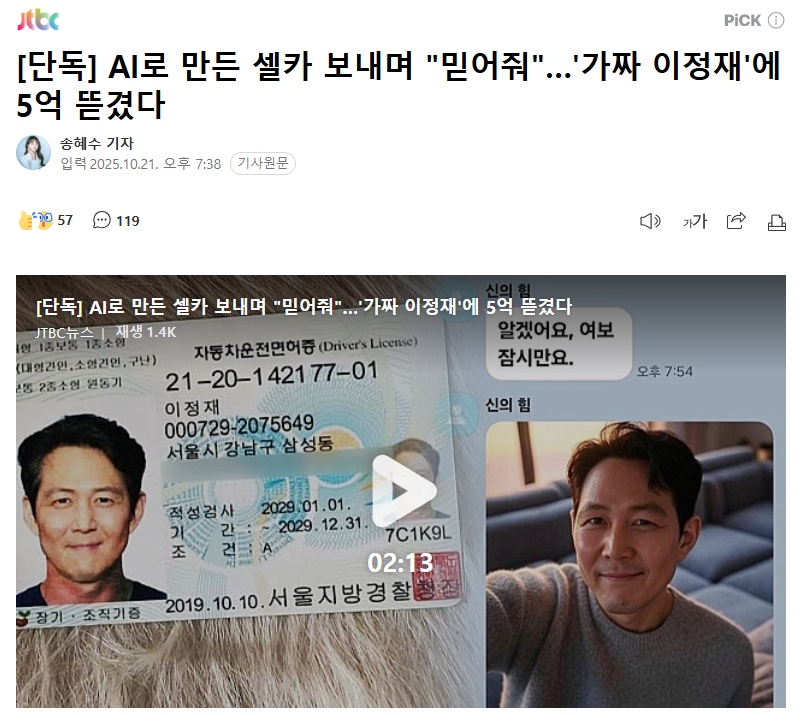 저는 그냥 채팅으로 사기를 치려는 것이니 쉽게 사기인걸 알아채지만, 요즘처럼 AI가 대세인 시대에서는 위에 서 언급한 가짜 이정재 AI영상이나 사진을 만들면 정말 꼼짝없이 당하겠구나 합니다.